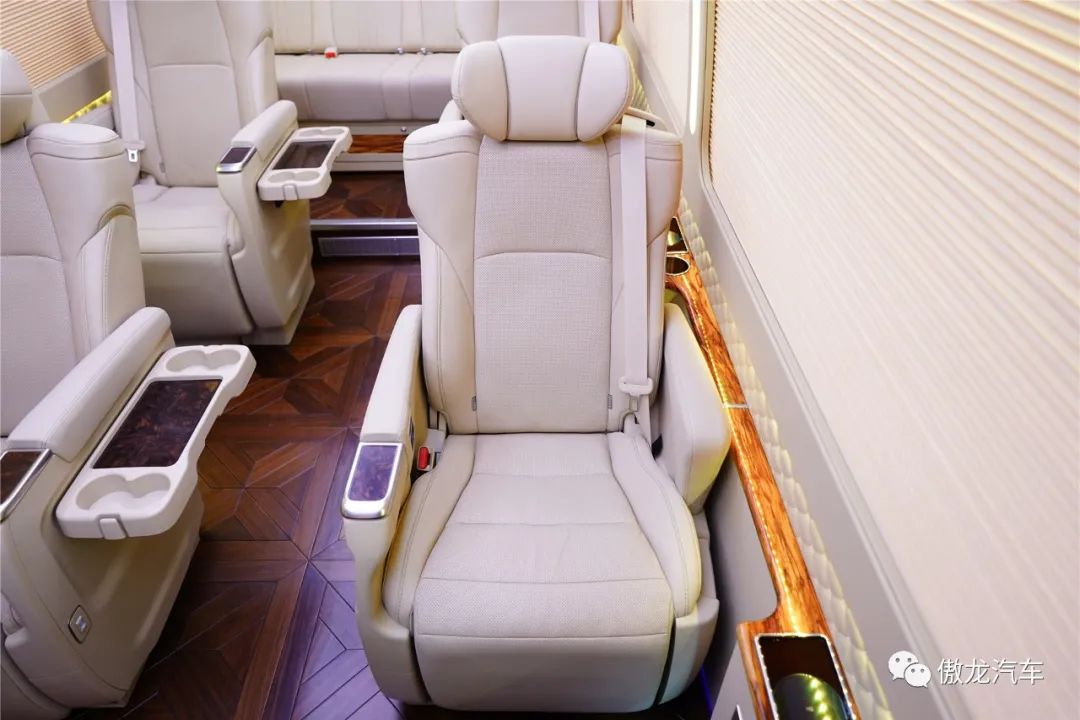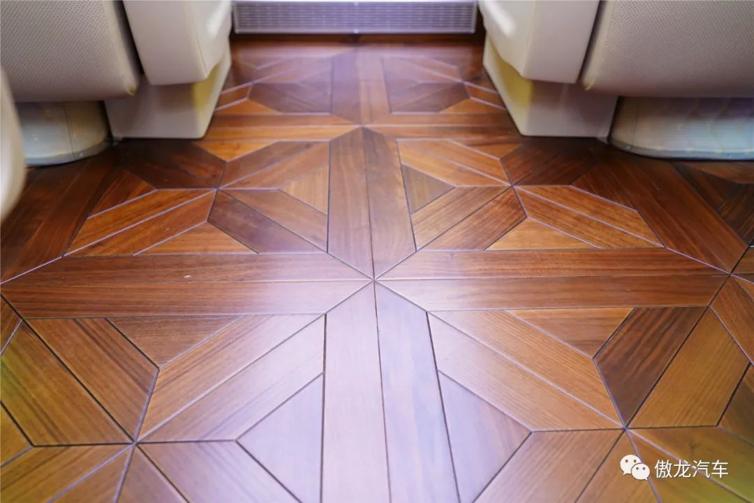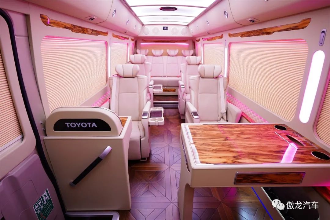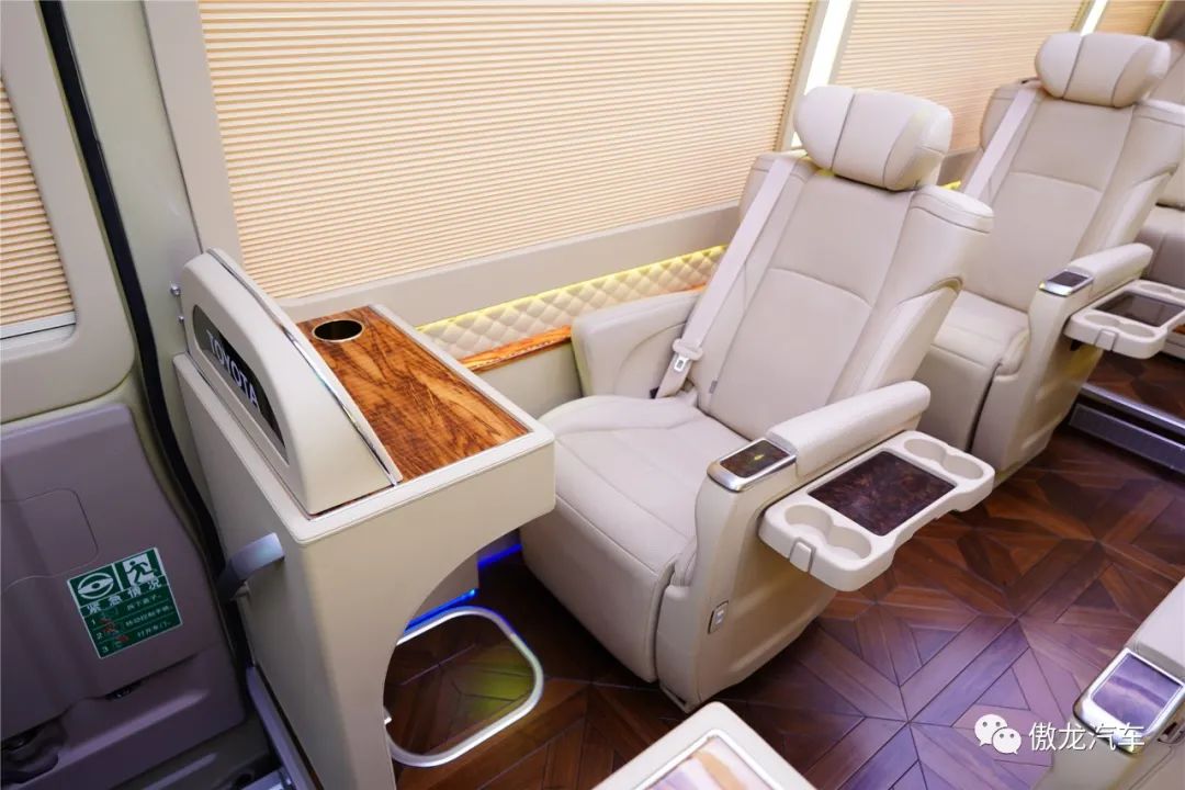 丰田考斯特12座尊享版车内铺设了深色梧桐木样式的游艇实木地板,桌面采用了当下最流行的龙血檀木设计,踏入车内将带给您如同观赏艺术品一般的视觉享受。
